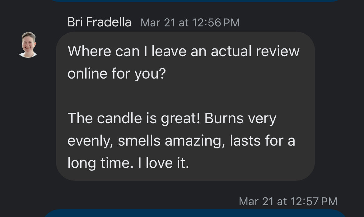 Here are some reviews from our customers. We appreciate each and every person who support. We make each and every candle out of love, so we love hearing how much you all enjoy your candles.